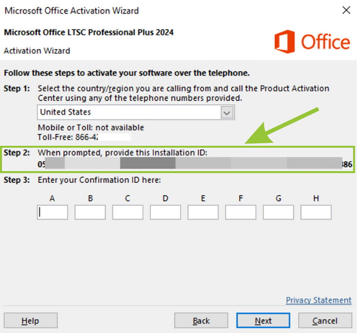 Open the Microsoft Office Activation Wizard and select “I want to activate the software by telephone.